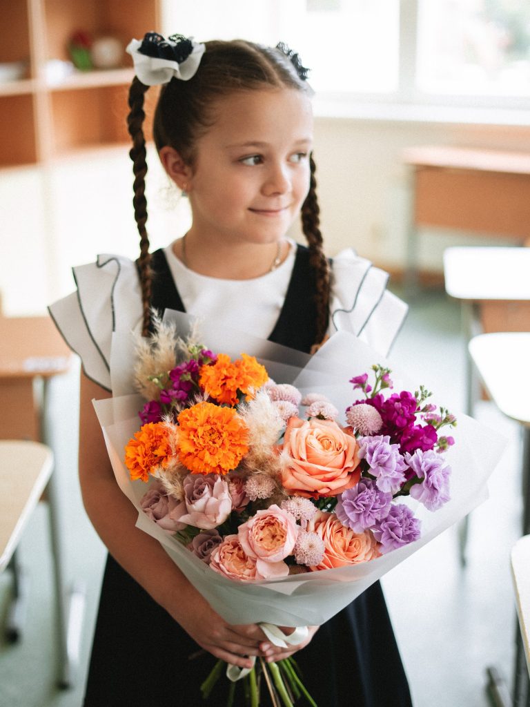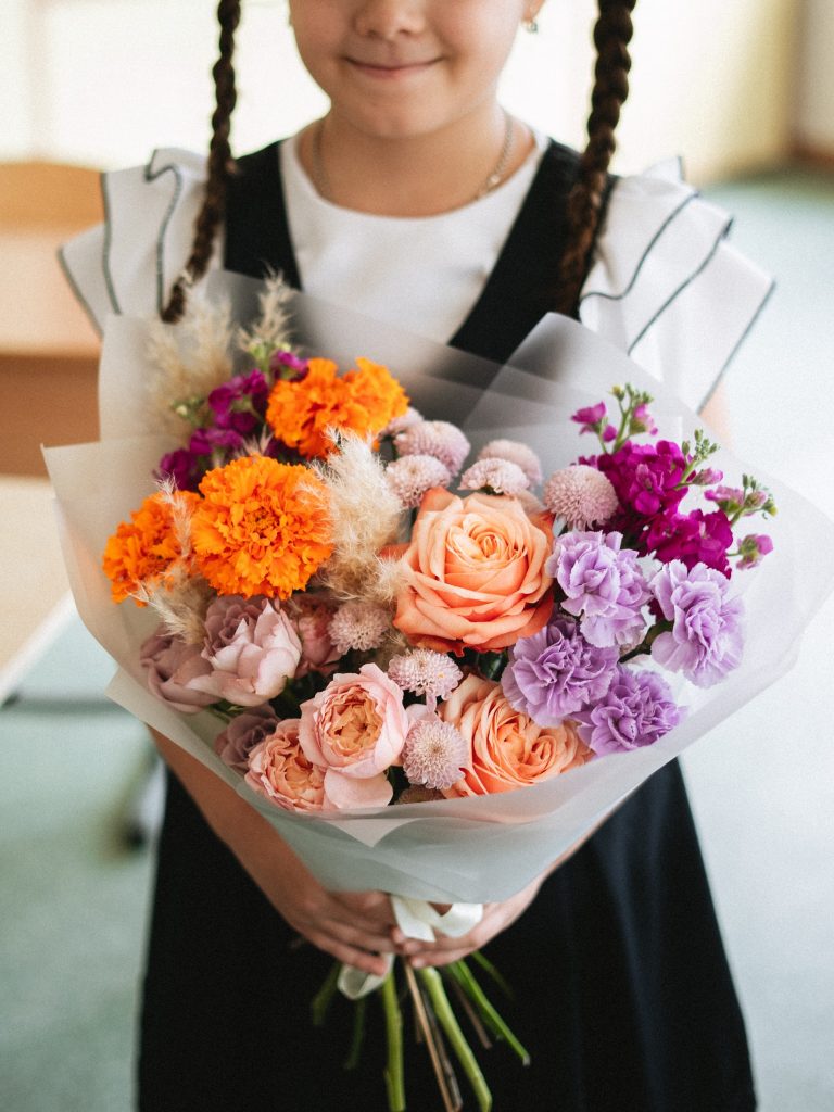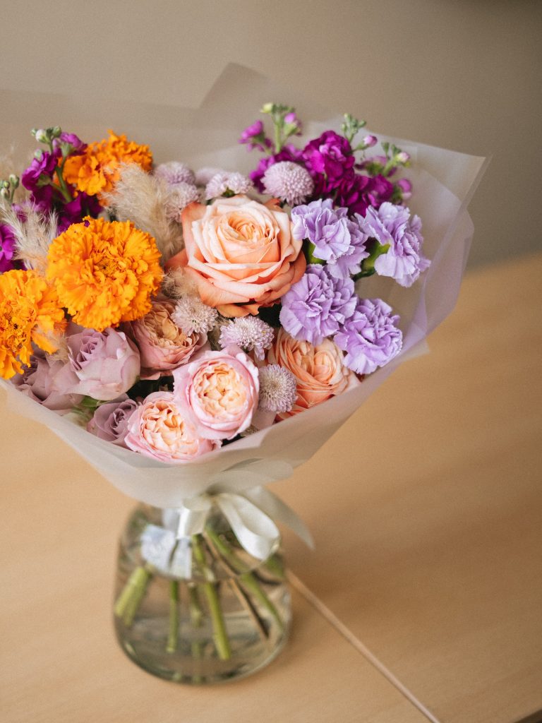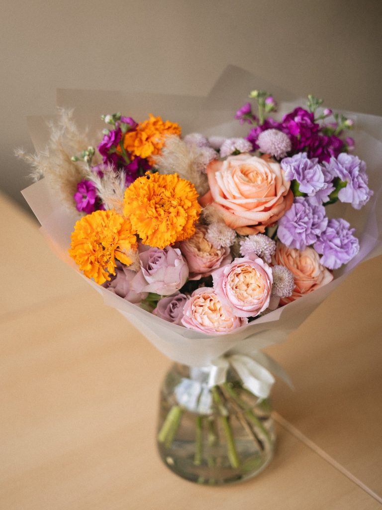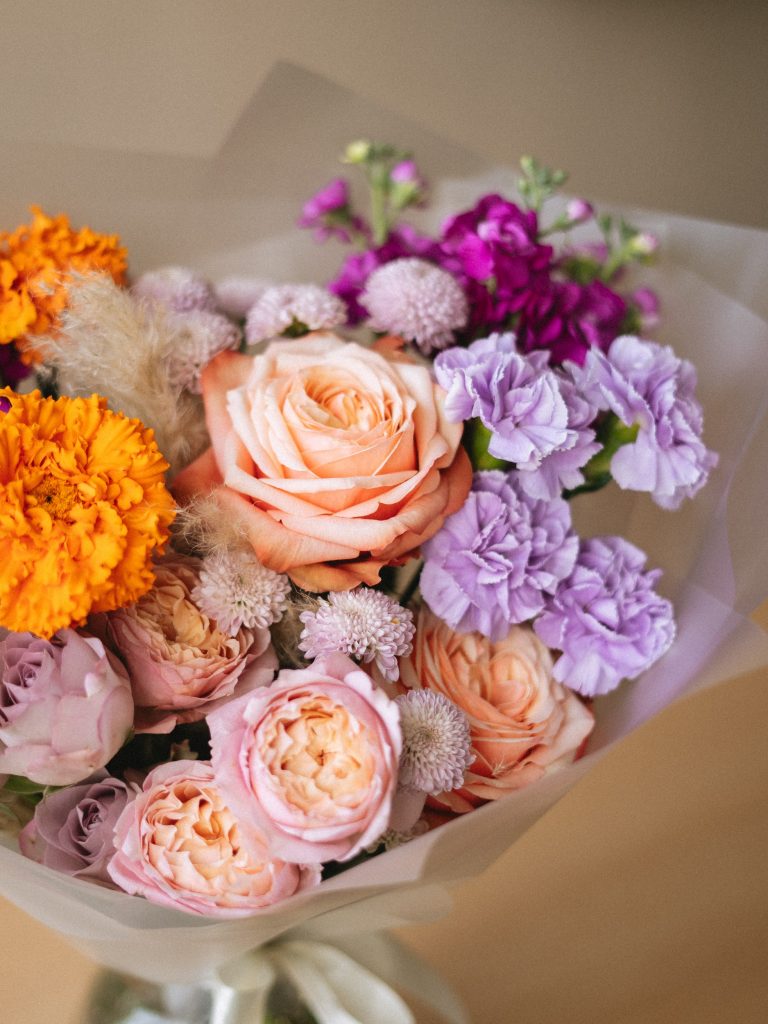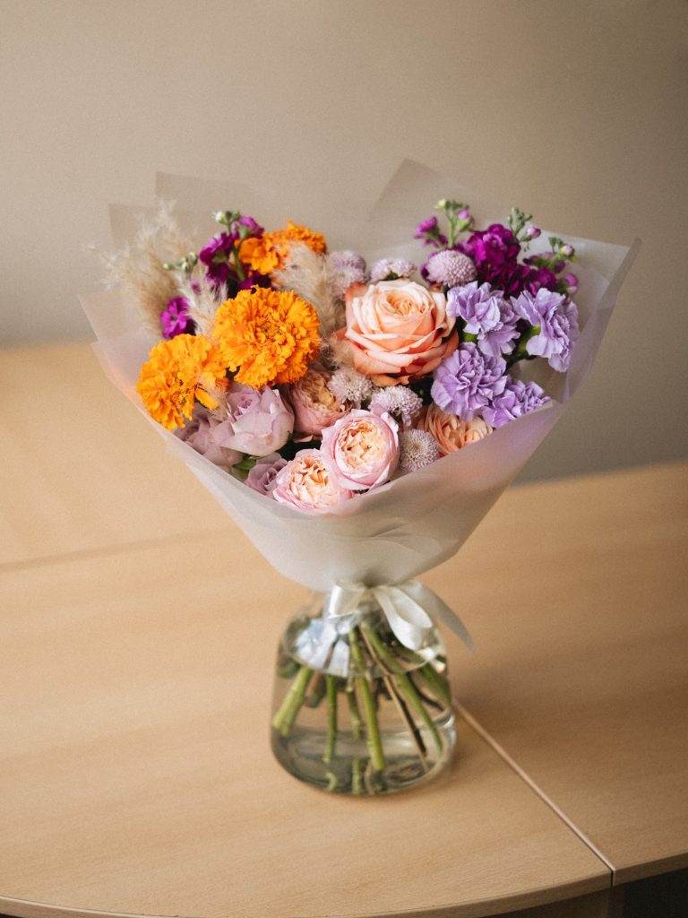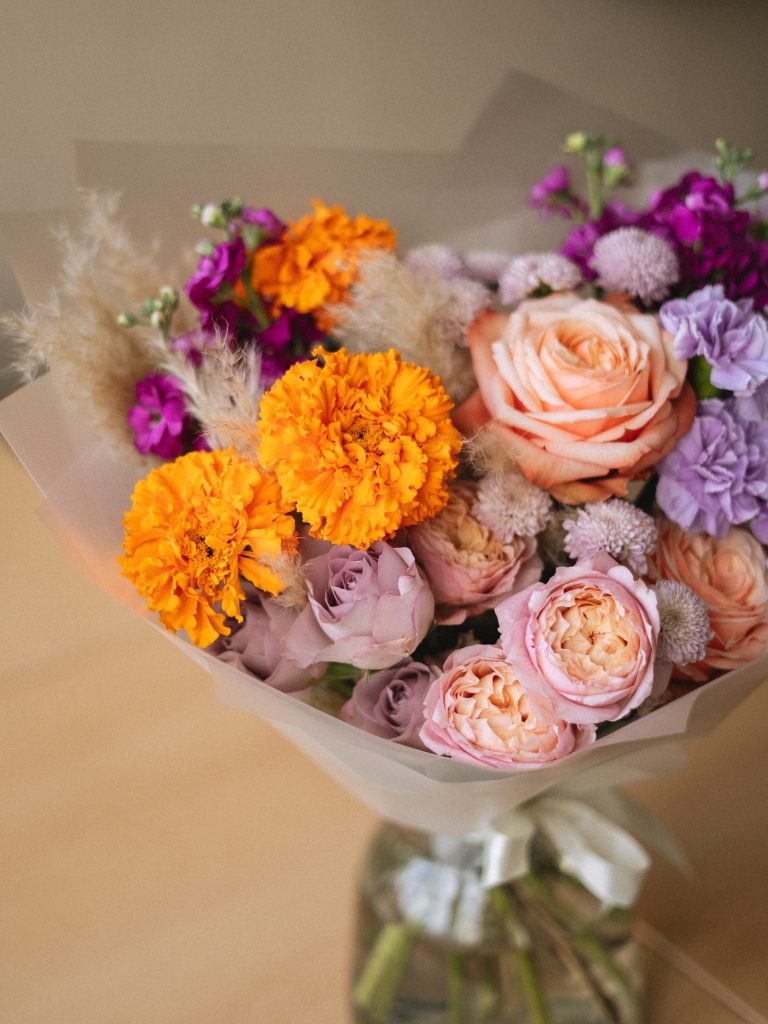Сезонные бархатцы и хризантема прекрасно гармонируют с пионовидной розой и диантусами нежно лавандового цвета. Кустовая маттиола порадует чарующим ароматом, а воздушная кортадерия и розы пудровых оттенков добавят нежности яркому букету.